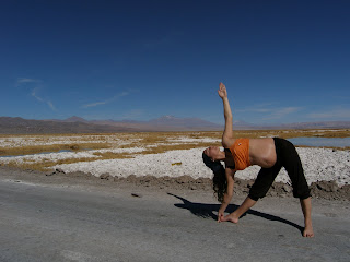 Muchos practicantes rayan el mat con una línea al centro para poder alinear los pies en muchas de las posturas de pie. Como en la foto, el pie izquierdo está apoyado en 45º y el derecho en 90º apuntando al frente. Sin mover los pies nos dejamos llevar por un suave impulso hasta enganchar el dedo gordo del pie derecho con las manos. Intentamos alinear los hombros en una misma recta, empujar el esternol hacia arriba y girar el pecho, más que la cabeza, la cual se alínea al final. Poco acostumbrados a observar nuestro cuerpo desde otra perspectiva tendemos a perder equilibrio en la mayoría de las posturas de pie. Esta es una excelente oportunidad para centrar nuestro eje partiendo siempre desde los pies. Es la base de la asana, como las raíces al árbol, nuestro enraice debe ser firme, para lograr equilibrio y goce en el desarrollo de la práctica.